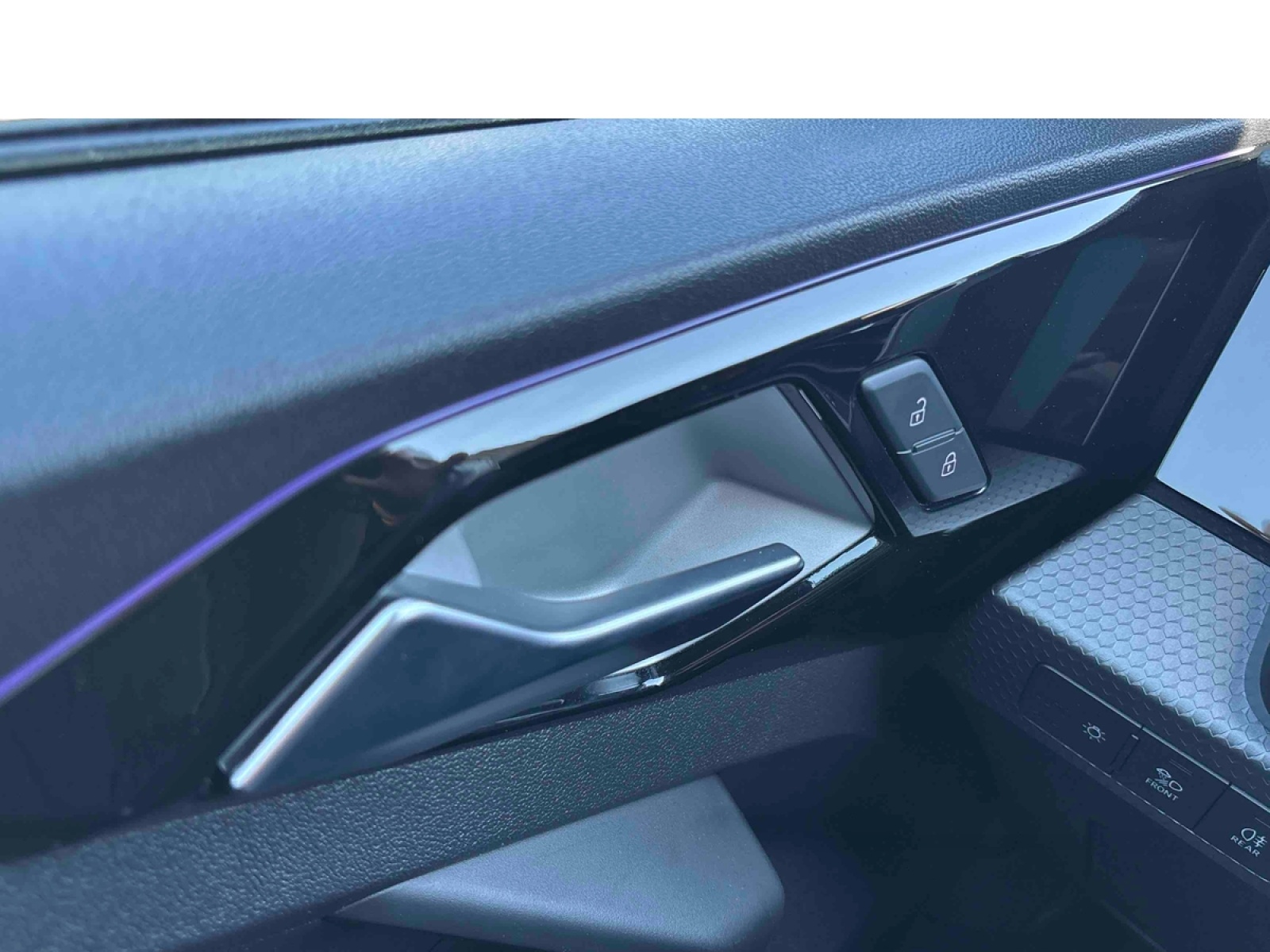 - Applications décoratives étendues en laque Quartz Gris structuré dans l'insert du diffuseur d'air et de la console centrale ainsi que dans la poignée de la commande intérieure de verrouillage des portières