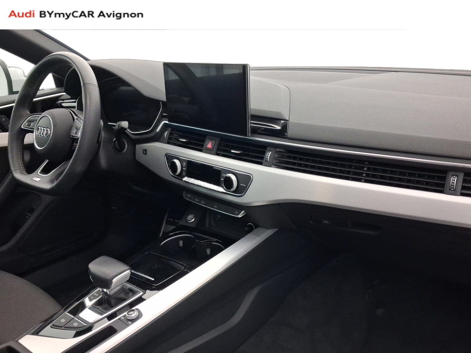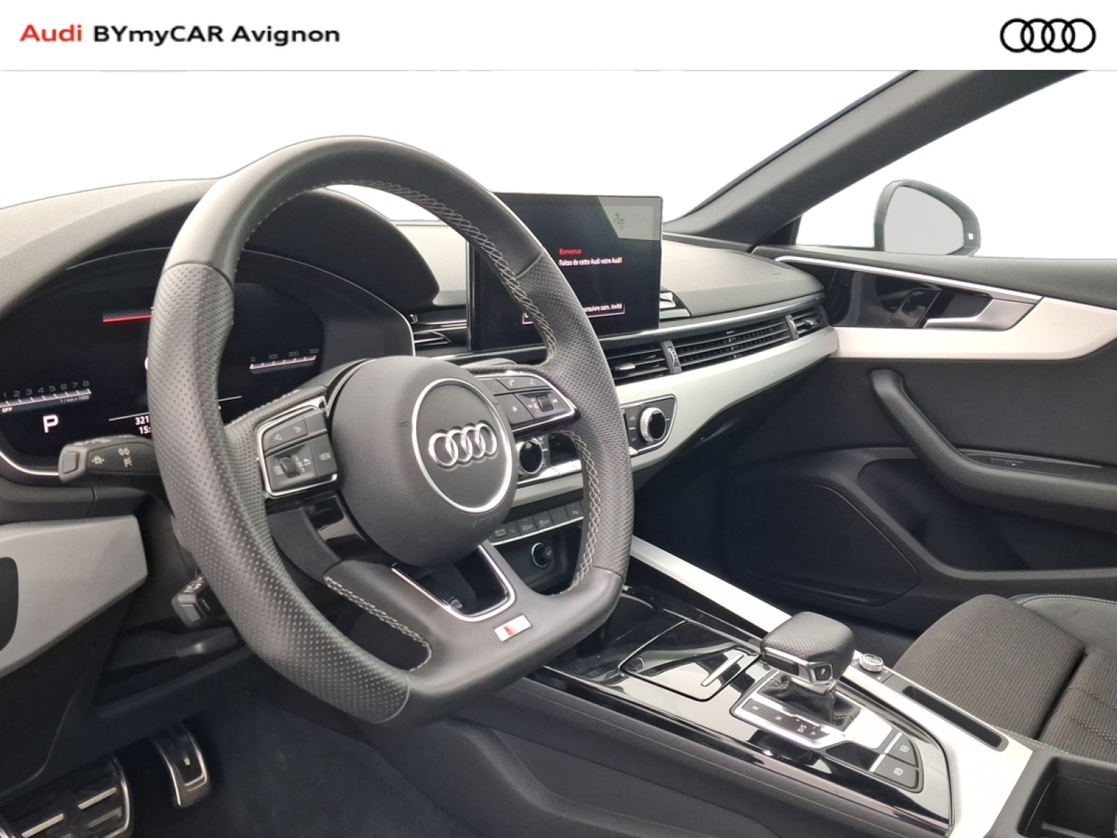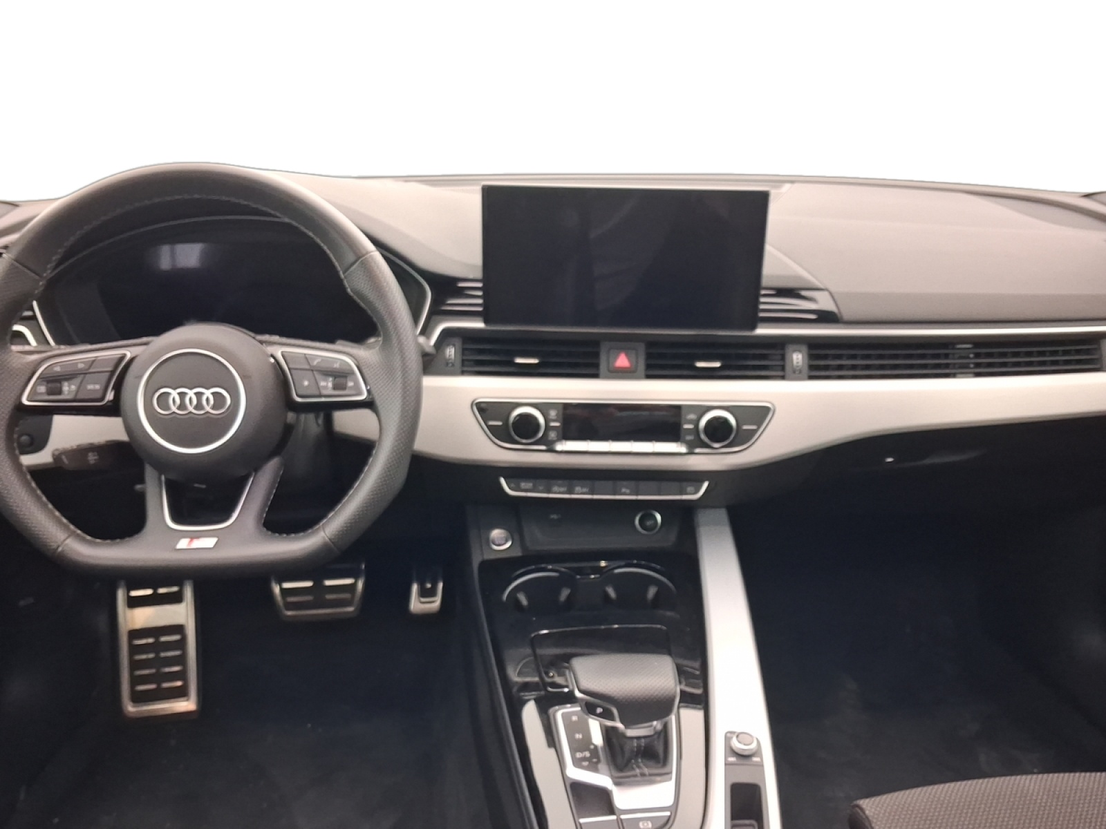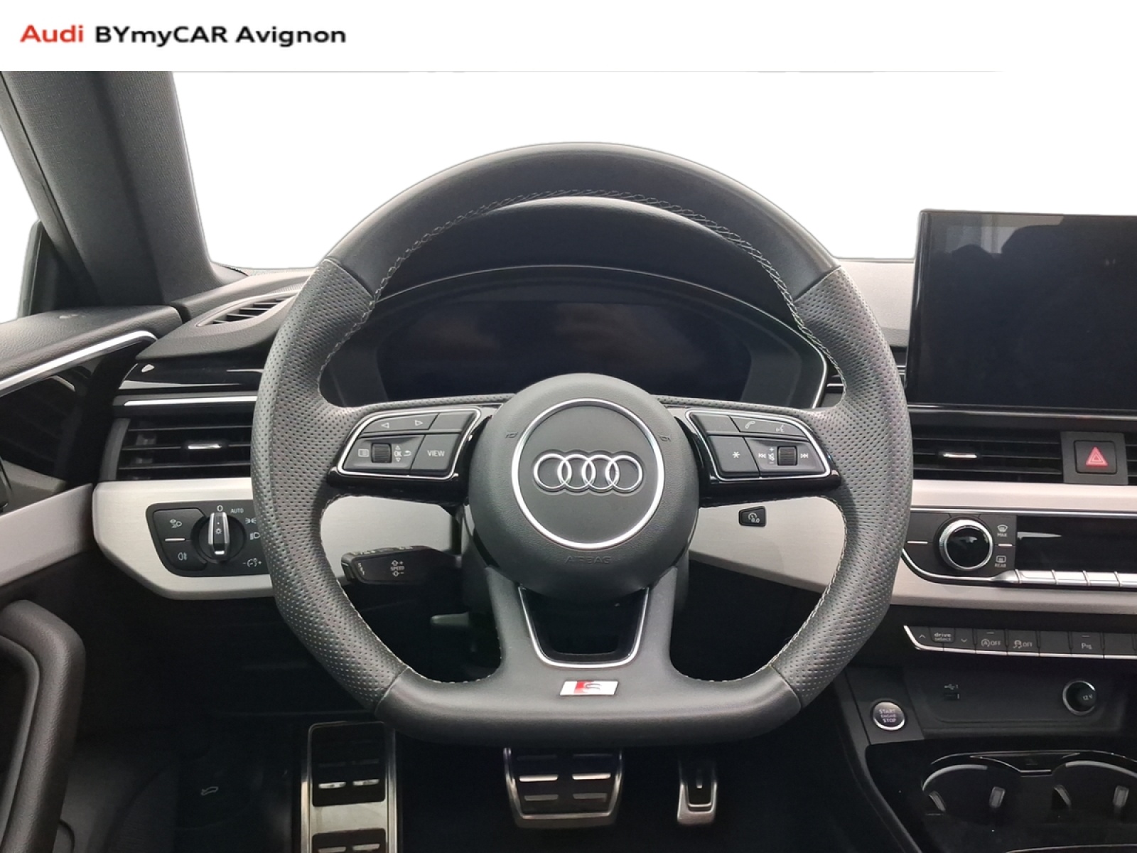 - Volant Sport contour en cuir style 3 branches, aplati en bas, avec multifonction plus avec palettes de changement de vitesse et avec logo S line et poignées de volant en cuir perforé