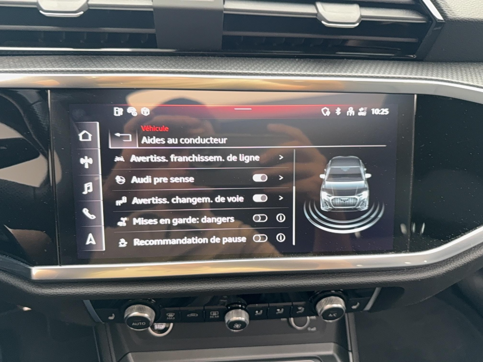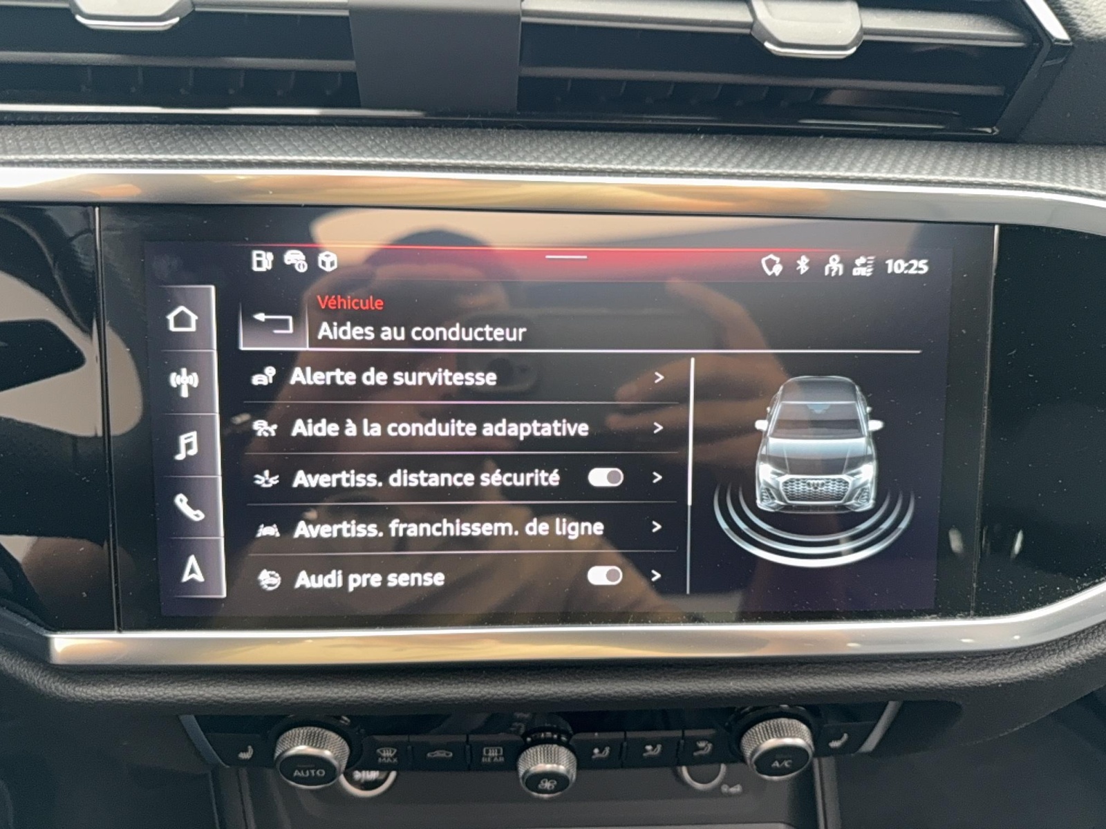 - Audi Pre Sense front Détecte la zone située devant le véhicule et avertit le conducteur par des signaux visuels et sonores en cas de potentielle situation dangereuse avec des véhicules qui précèdent ou qui sont arrêtés. Le système avertit alors le conducteur par un signal sonore et visuel. Simultanément, le système prépare un éventuel freinage complet, et engage un freinage d'urgence automatisé, dans le cas où celui-ci s'avérerait nécessaire