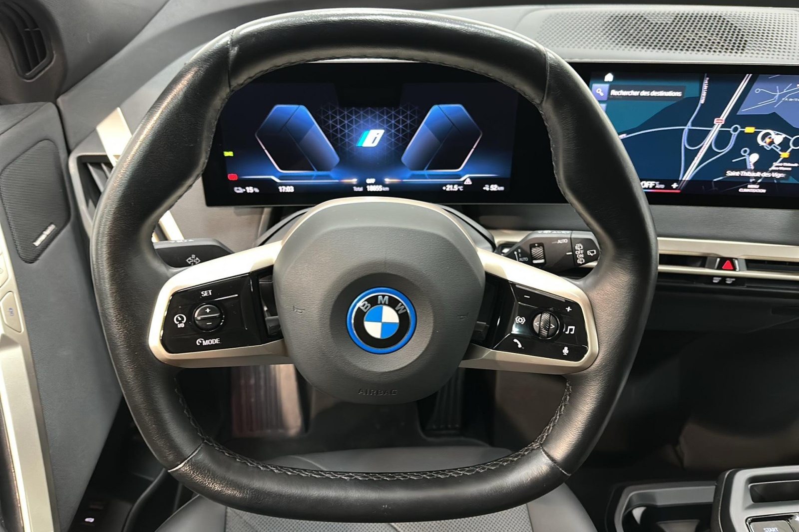 - Volant à 2 branches avec anneau bleu autour de l'emblème BMW, aplati en bas, avec touches multifonctions, en cuir Nappa