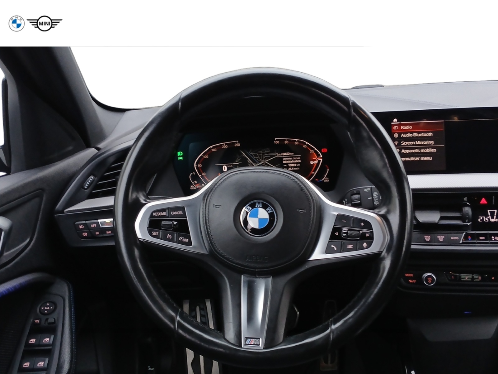 - Volant M gainé cuir Trois branches, aplati en bas et marque à 12 heures en noir. Volant en cuir noir 'Walknappa' avec surpiqûres noires, inserts chrome nacré et repose-pouce dans le volant. Logo M sur la base du volant.