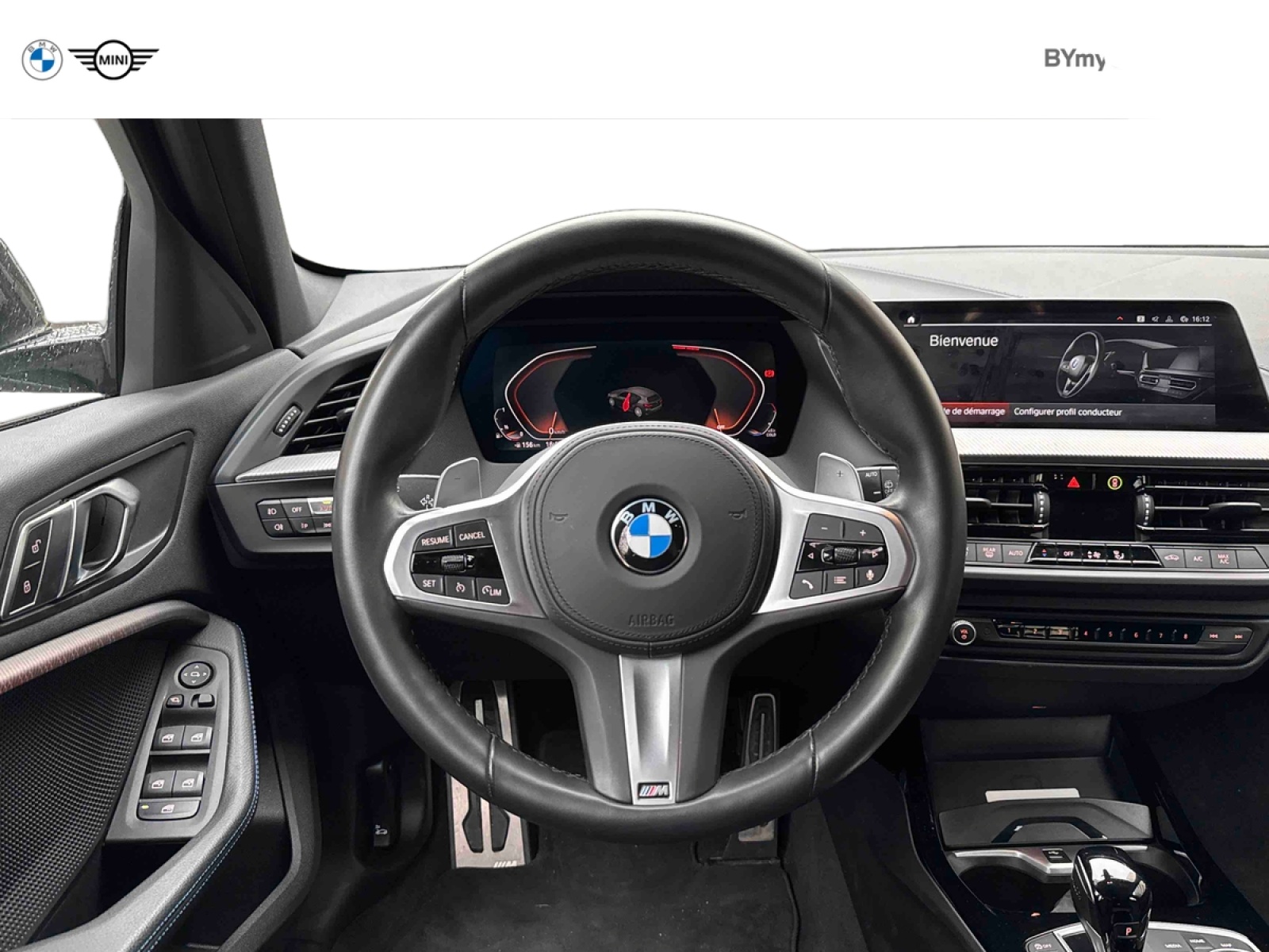 - Volant M gainé cuir Trois branches, aplati en bas et marque à 12 heures en noir. Volant en cuir noir 'Walknappa' avec surpiqûres noires, inserts chrome nacré et repose-pouce dans le volant. Logo M sur la base du volant.