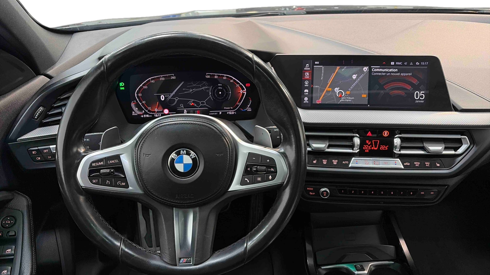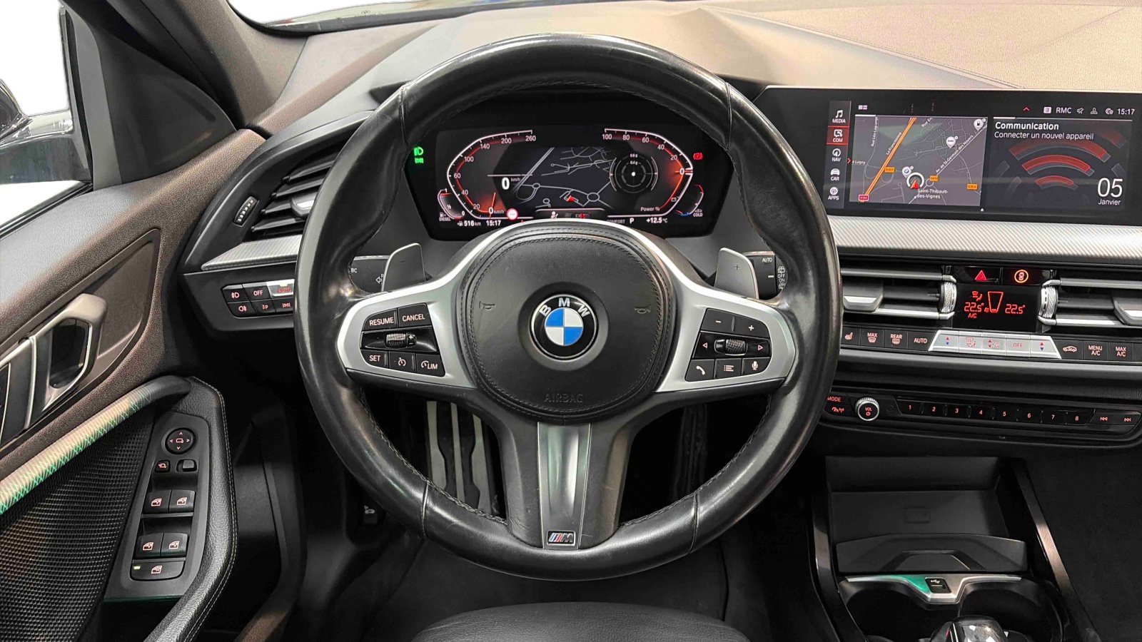 - Volant M gainé cuir Trois branches, aplati en bas et marque à 12 heures en noir. Volant en cuir noir 'Walknappa' avec surpiqûres noires, inserts chrome nacré et repose-pouce dans le volant. Logo M sur la base du volant.