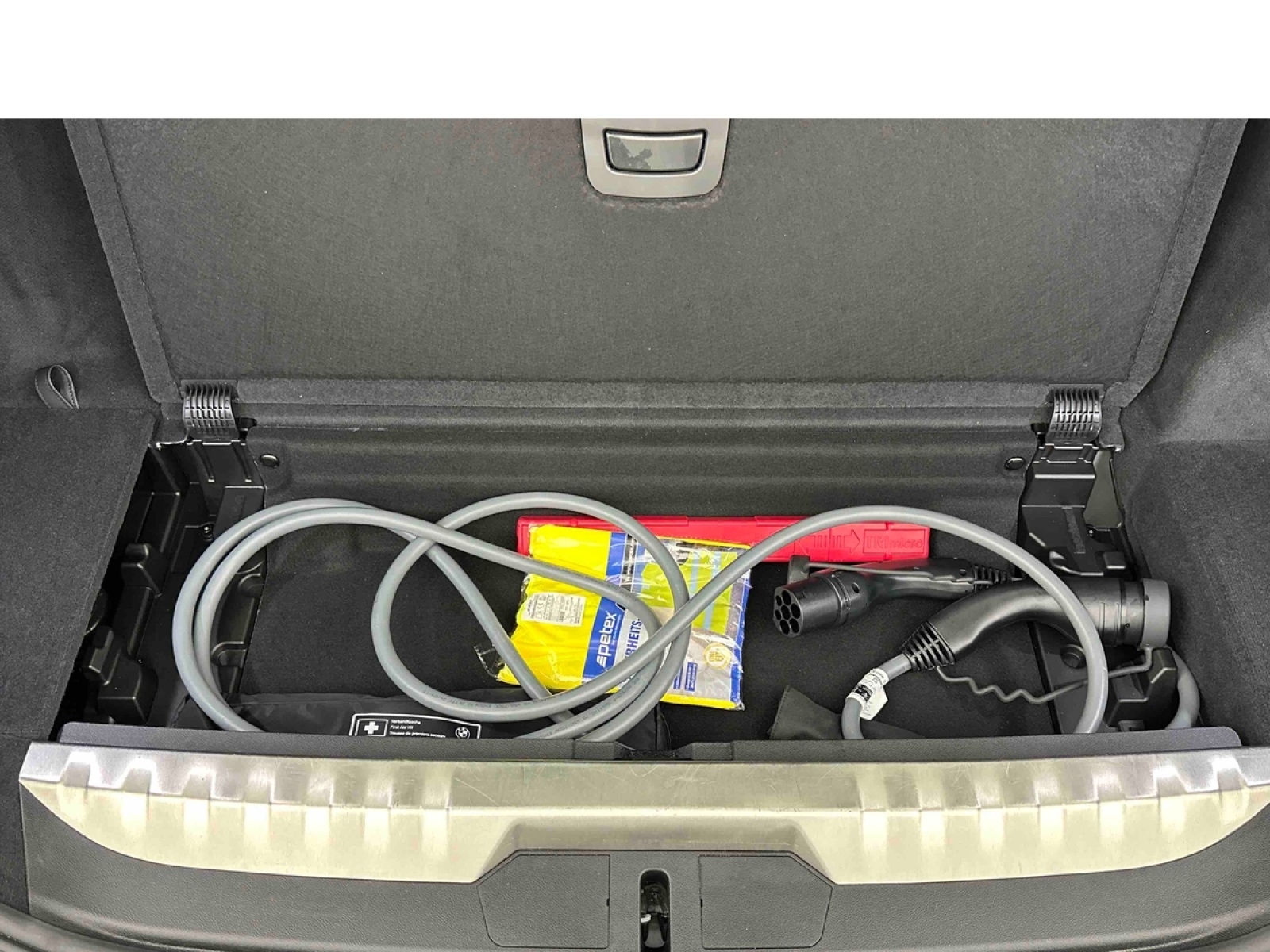 - Kit de mobilité BMW Bouteille de mastic pour pneumatiques - compresseur électrique 12 V (connexion à une prise 12V) à gauche dans le compartiment à bagages