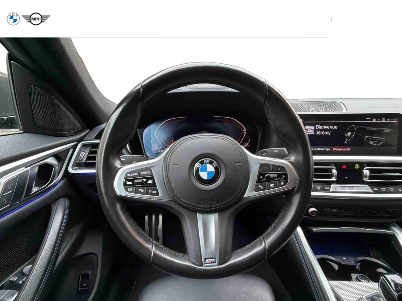 - Volant M gainé cuir Trois branches, aplati en bas et marque à 12 heures en noir. Volant en cuir noir 'Walknappa' avec surpiqûres noires, inserts chrome nacré et repose-pouce dans le volant. Logo M sur la base du volant.