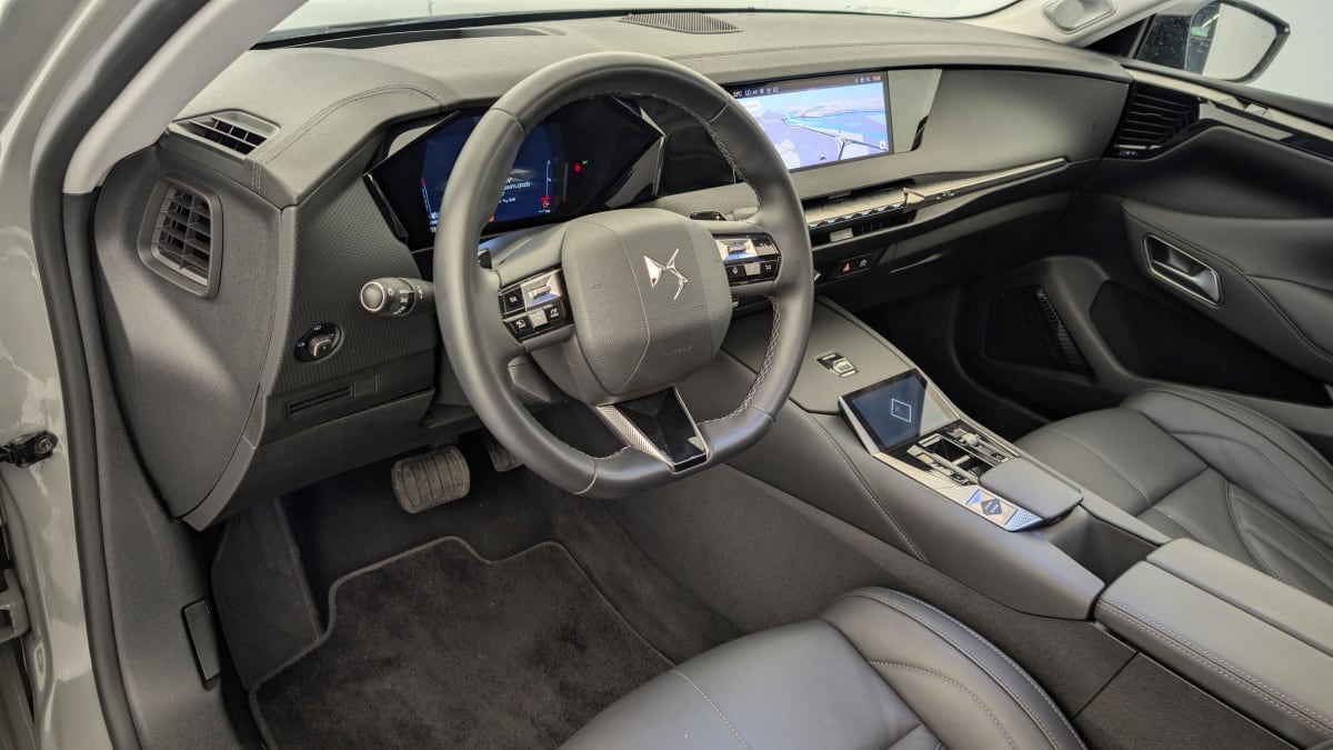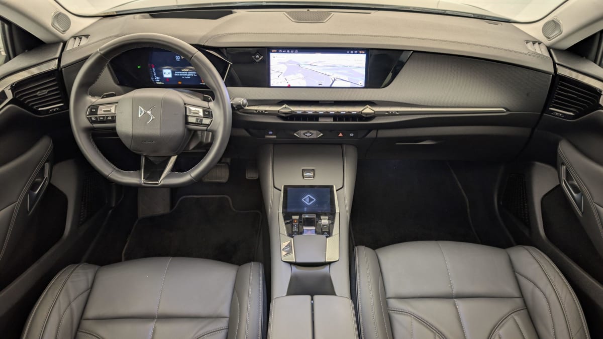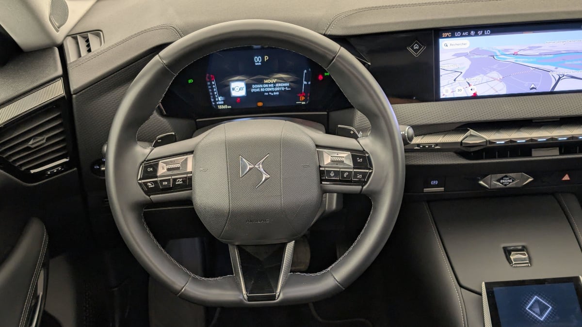 - Intérieur Cuir grainé Noir Basalte : Sellerie en Cuir grainé Noir Basalte Décors de panneaux de porte Chrome guilloché Volant en cuir fleur Mistral Console centrale en Toile DS Mistral Planche de bord en toile DS Noir Basalte façon écaille Panneaux de portes en toile DS Noir Basalte façon écaille Ciel de pavillon Salin