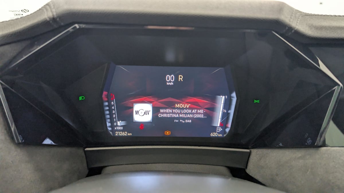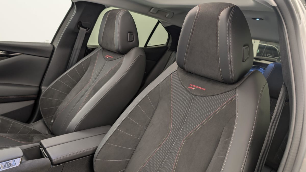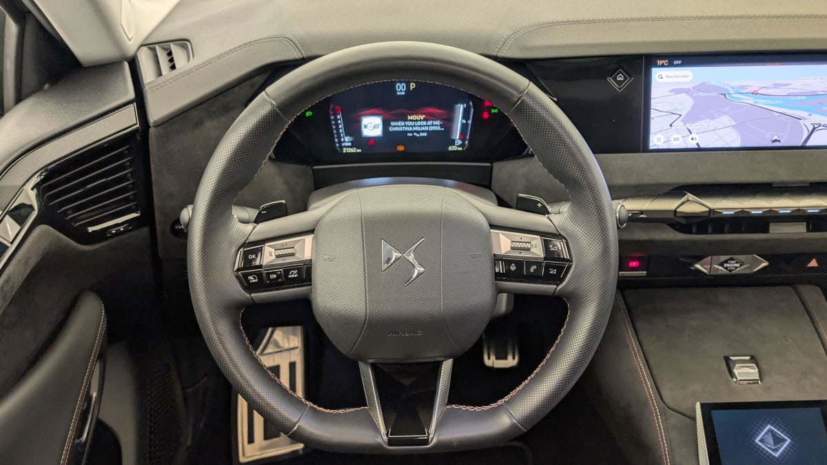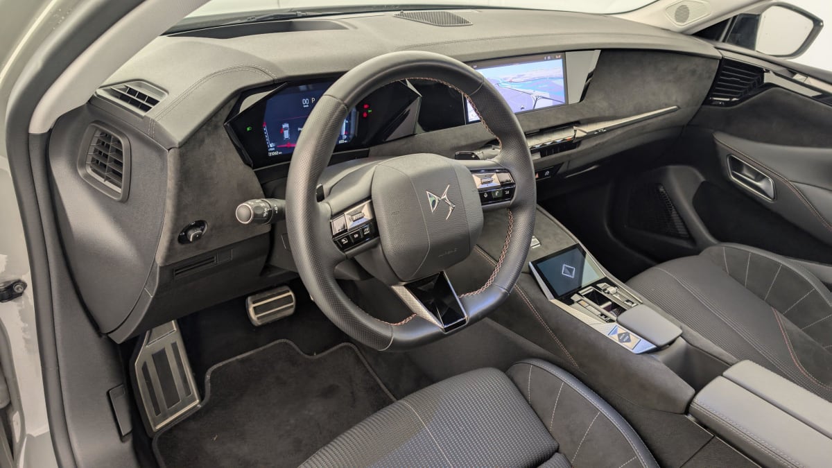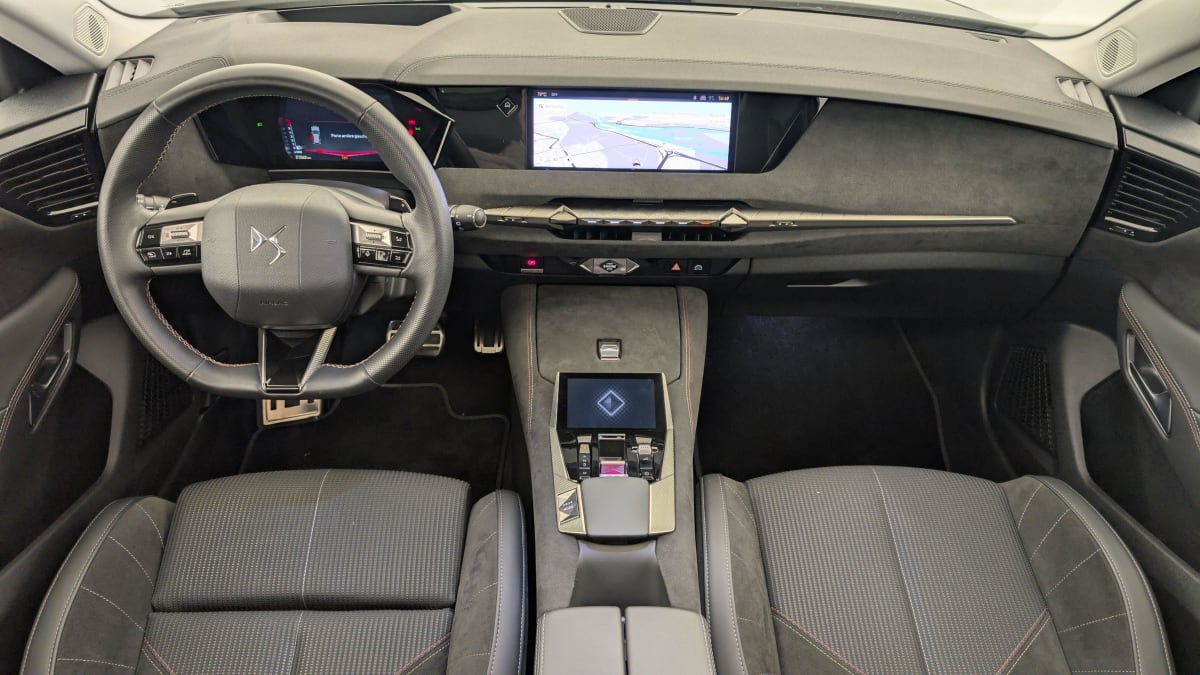 - Intérieur Tissu Tressé Basalte avec Alcantara : Planche de bord en alcantara Panneaux de portes en alcantara Console centrale en alcantara Sellerie en Tissu Tressé Basalte avec Alcantara et toile DS Décors de panneaux de porte Chrome guilloché Volant en cuir fleur Mistral avec surpiqûres Ciel de pavillon Salin