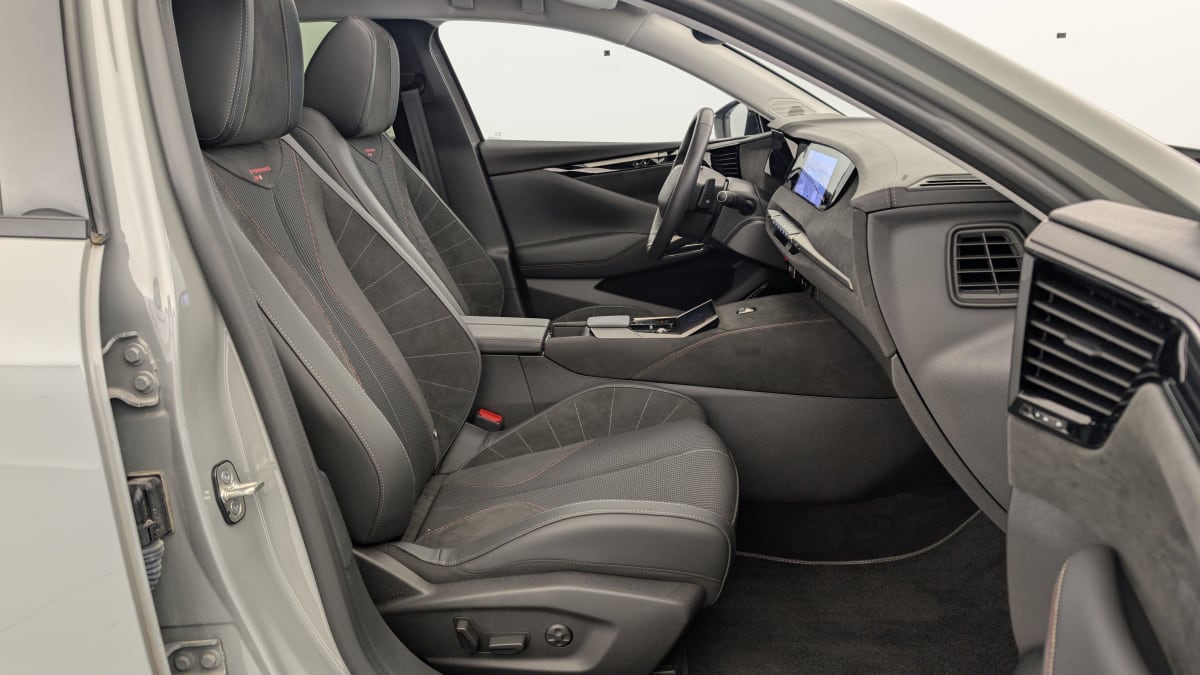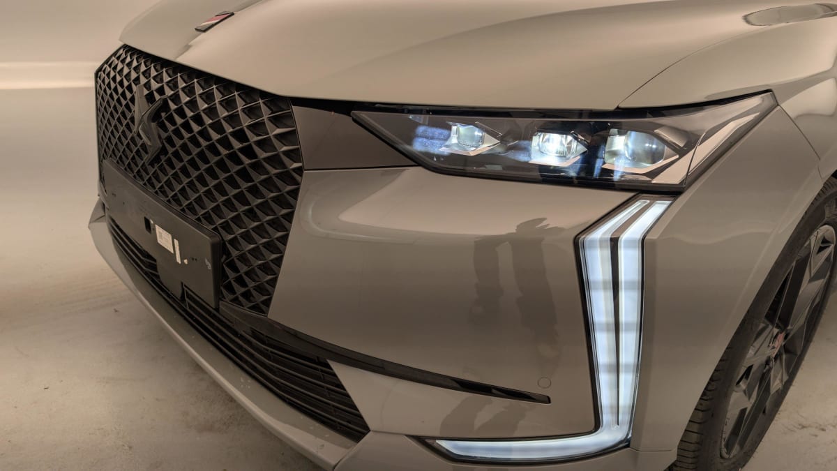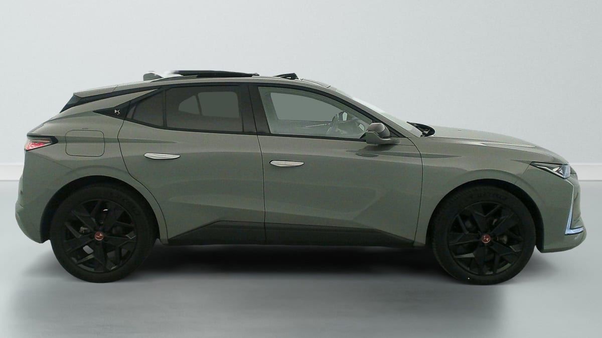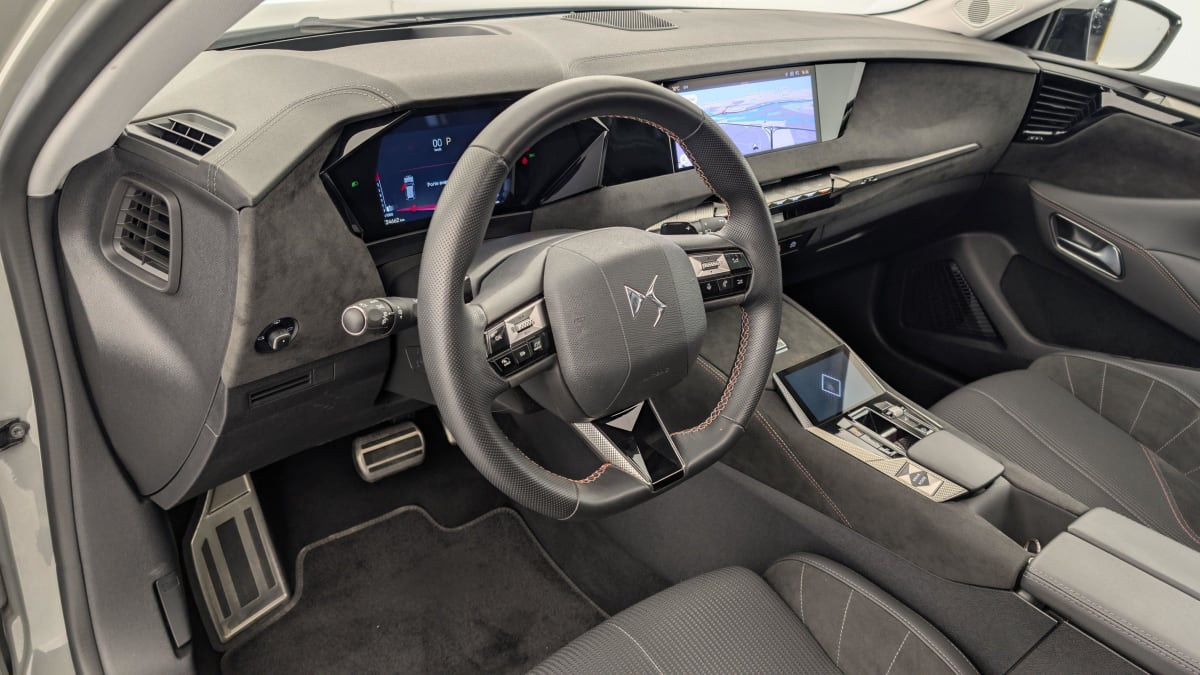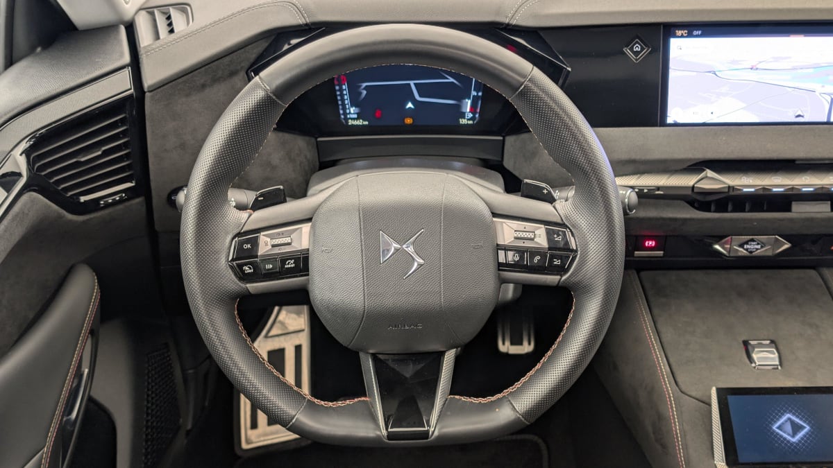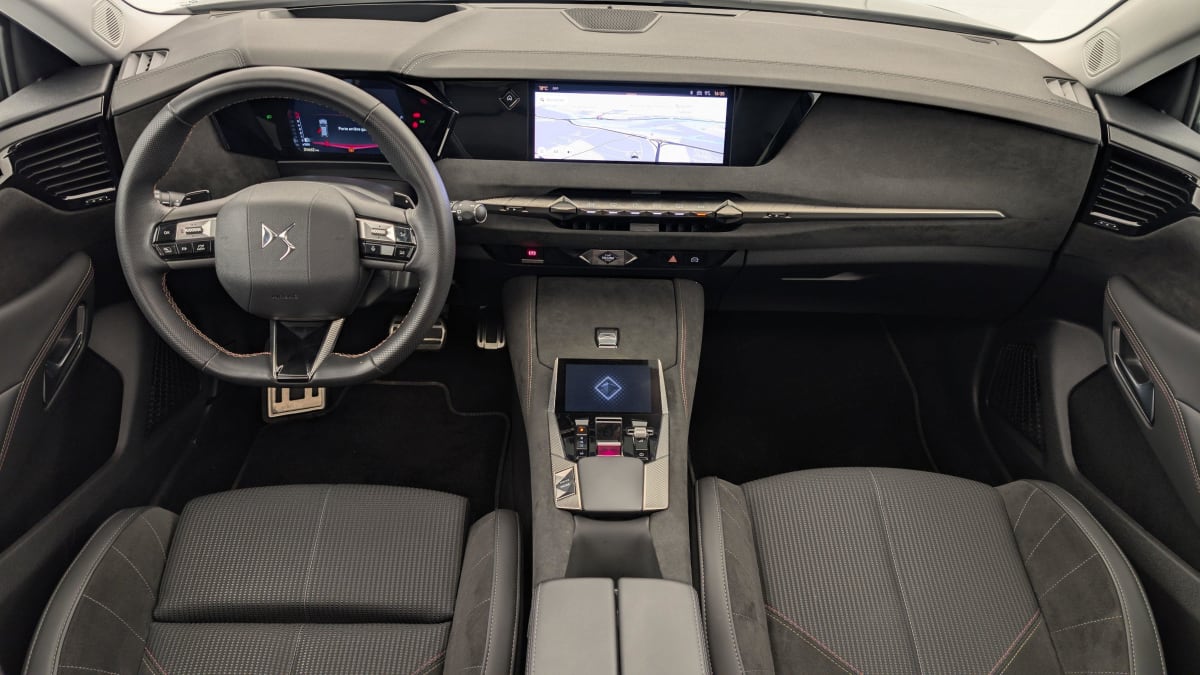 - Intérieur Tissu Tressé Basalte avec Alcantara : Planche de bord en alcantara Panneaux de portes en alcantara Console centrale en alcantara Sellerie en Tissu Tressé Basalte avec Alcantara et toile DS Décors de panneaux de porte Chrome guilloché Volant en cuir fleur Mistral avec surpiqûres Ciel de pavillon Salin
