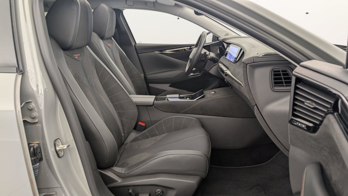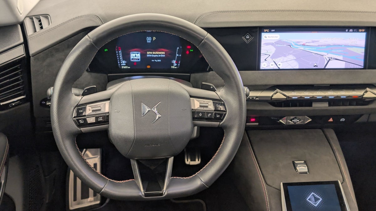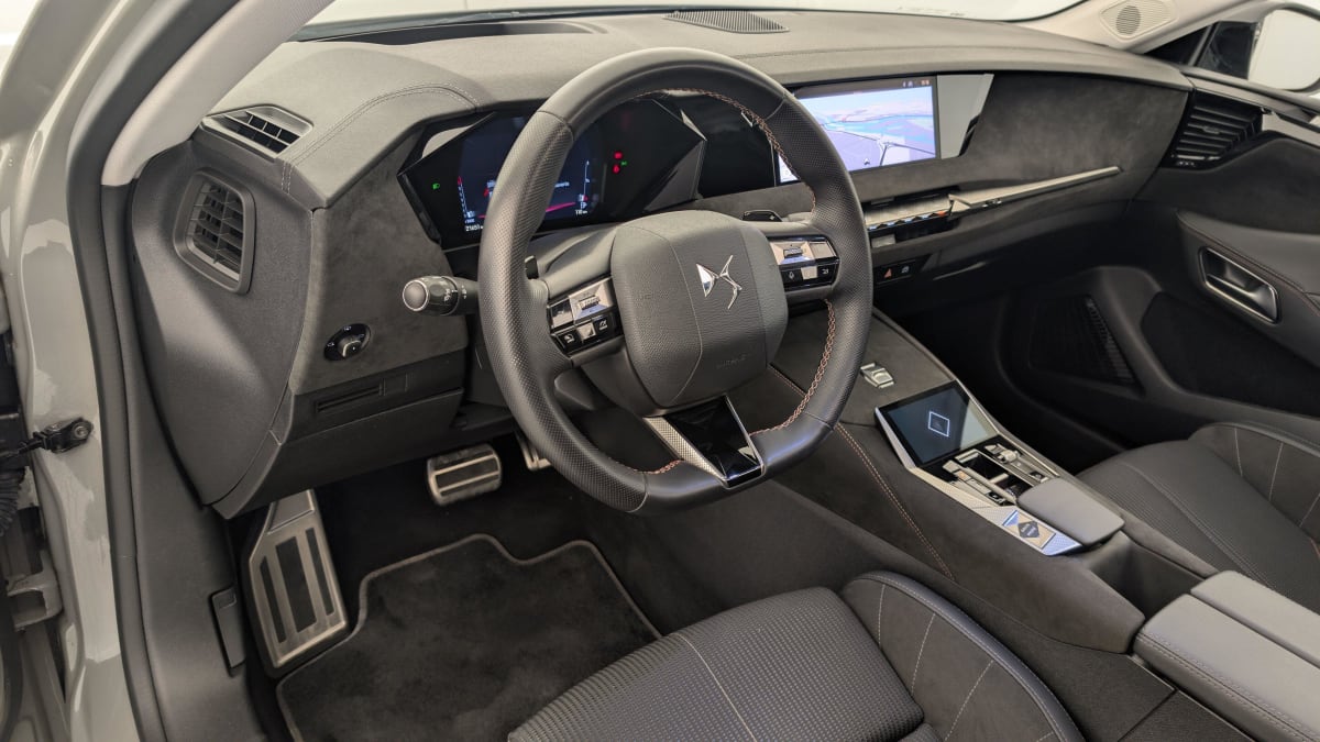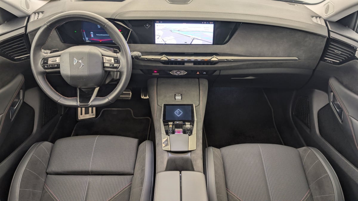 - Intérieur Tissu Tressé Basalte avec Alcantara : Planche de bord en alcantara Panneaux de portes en alcantara Console centrale en alcantara Sellerie en Tissu Tressé Basalte avec Alcantara et toile DS Décors de panneaux de porte Chrome guilloché Volant en cuir fleur Mistral avec surpiqûres Ciel de pavillon Salin