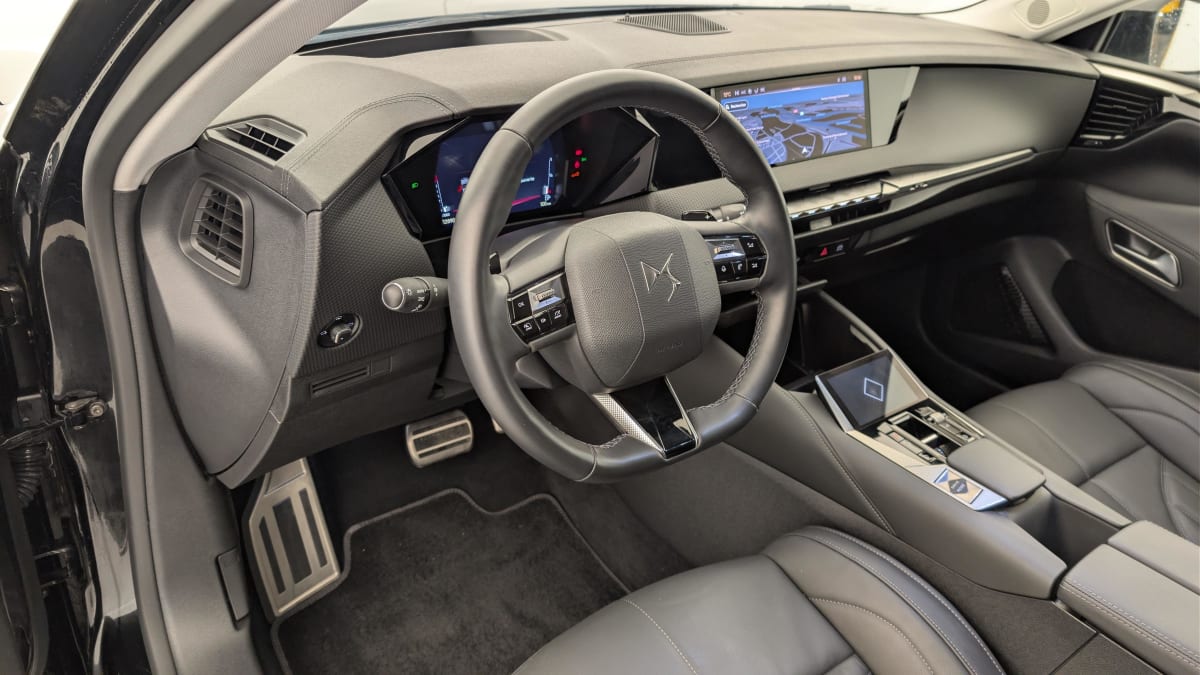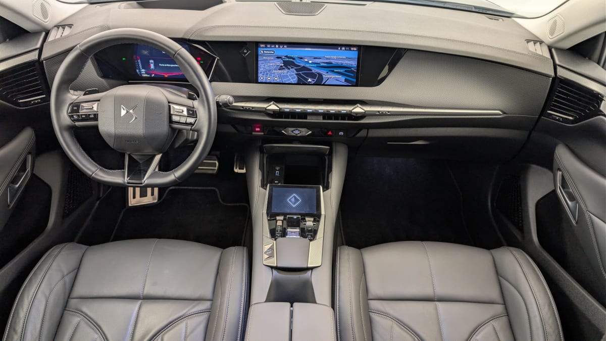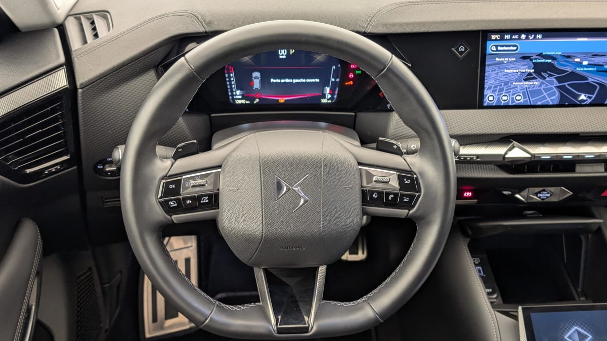 - Intérieur Cuir Noir Basalte : Surtapis AV/AR Seuils de portes en métal avec Trame DS Plip avec insert Chromé Sièges AV à haute densité Volant Cuir gainé avec insert Noir Brillant Guillochage "Clous de Paris" Platine Sellerie en Cuir grainé Noir Basalte Décor Noir Basalte façon écaille