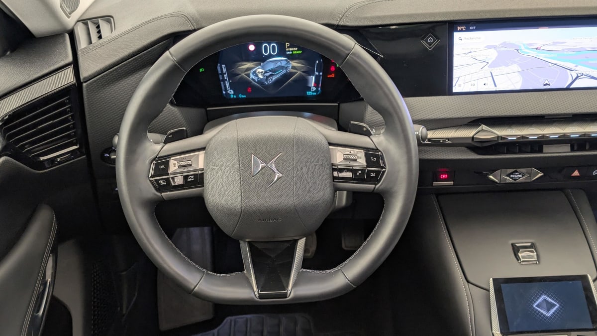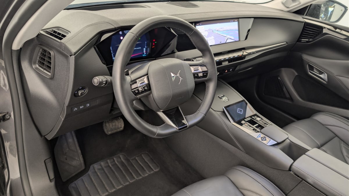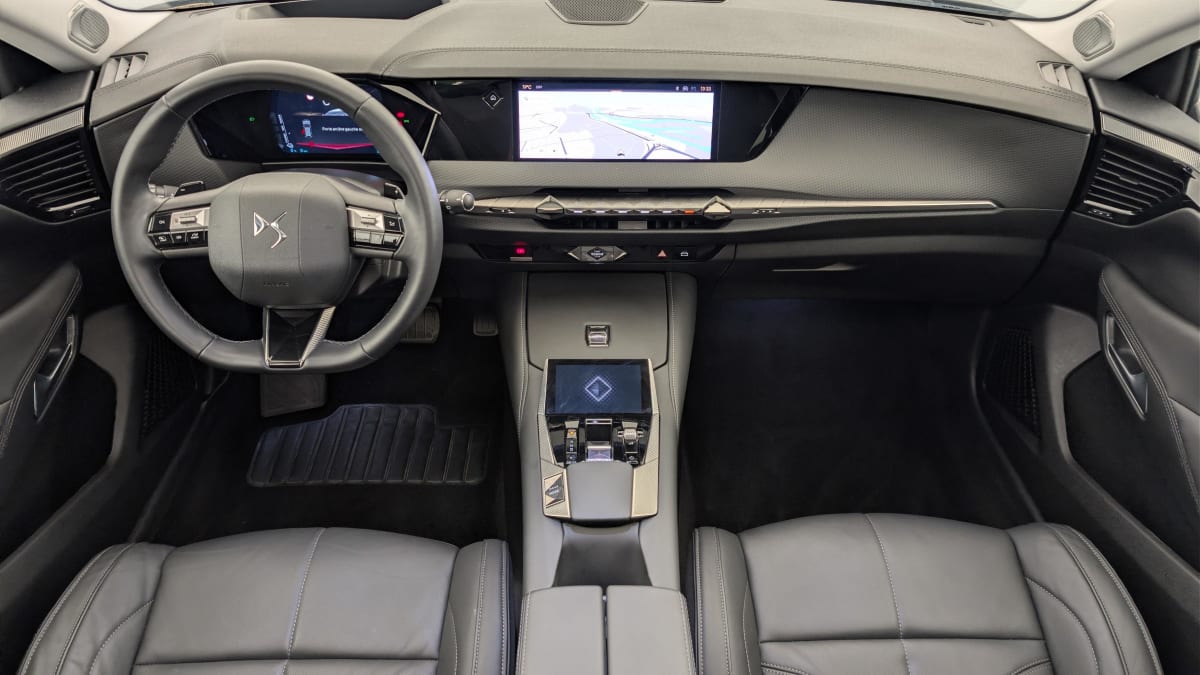 - Intérieur Cuir grainé Noir Basalte : Sellerie en Cuir grainé Noir Basalte Décors de panneaux de porte Chrome guilloché Volant en cuir fleur Mistral Console centrale en Toile DS Mistral Planche de bord en toile DS Noir Basalte façon écaille Panneaux de portes en toile DS Noir Basalte façon écaille Ciel de pavillon Salin