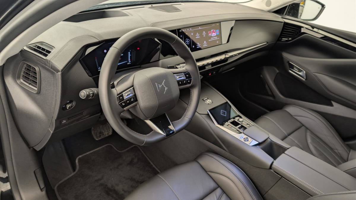 - Intérieur Cuir grainé Noir Basalte et Toile DS : Ciel de pavillon clair Décors de panneaux de porte Chrome guilloché Volant en cuir fleur Mistral Console centrale en Toile DS Mistral Planche de bord en toile DS Noir Basalte façon écaille Panneaux de portes en toile DS Noir Basalte façon écaille Sellerie en Cuir grainé Noir Basalte et Toile DS Parties centrales des sièges AV, partie centrale des sièges latéraux AR et partie AV des appuie-tête en cuir. Bourrelets latéraux des sièges AV, accoudoir central et siège central AR, et parties latérales et AR des appuis tête en Toile DS.