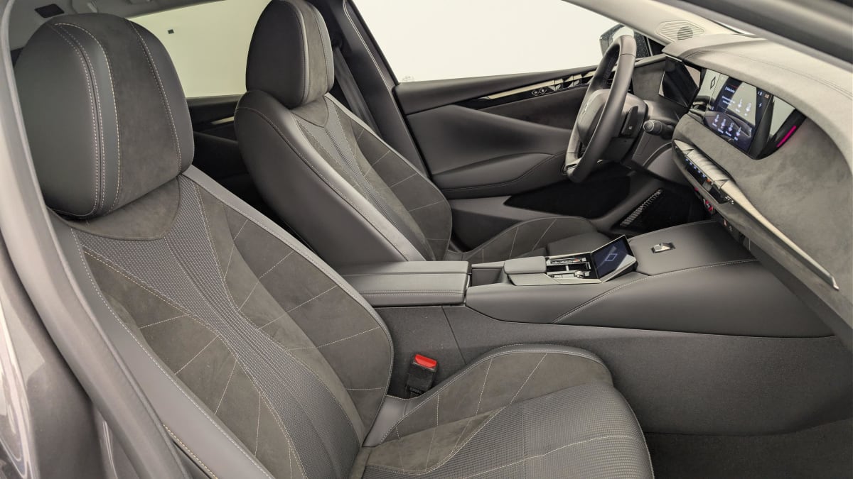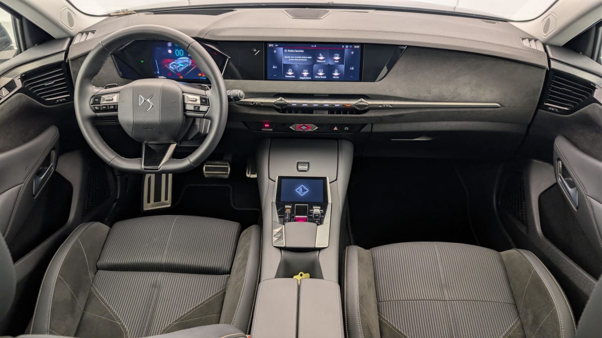- Intérieur Alcantara Noir : Planche de bord en Alcantara Ciel de pavillon clair Décors de panneaux de porte Chrome guilloché Volant cuir Fleur Mistral Console en toile DS Noir Basalte Panneaux de porte en Alcantara et Toile DS Noir Basalte Sellerie en Tissu Tressé Basalte avec Alcantara et toile DS