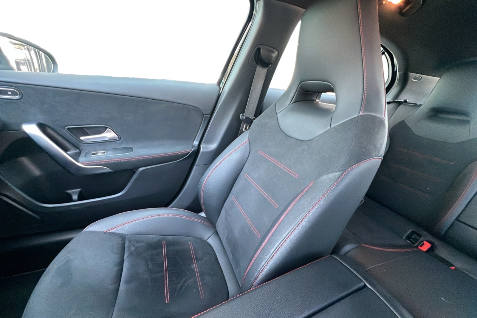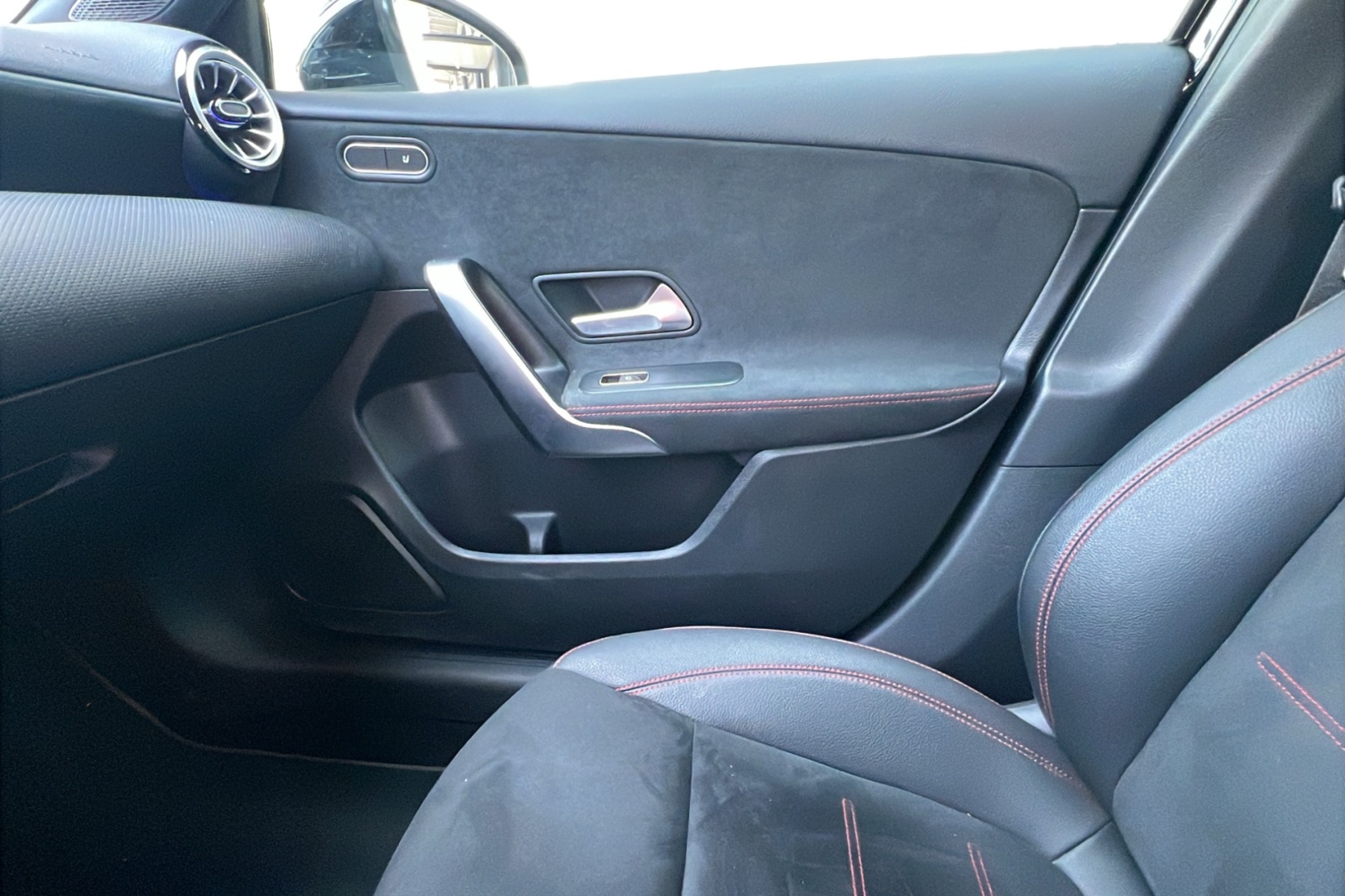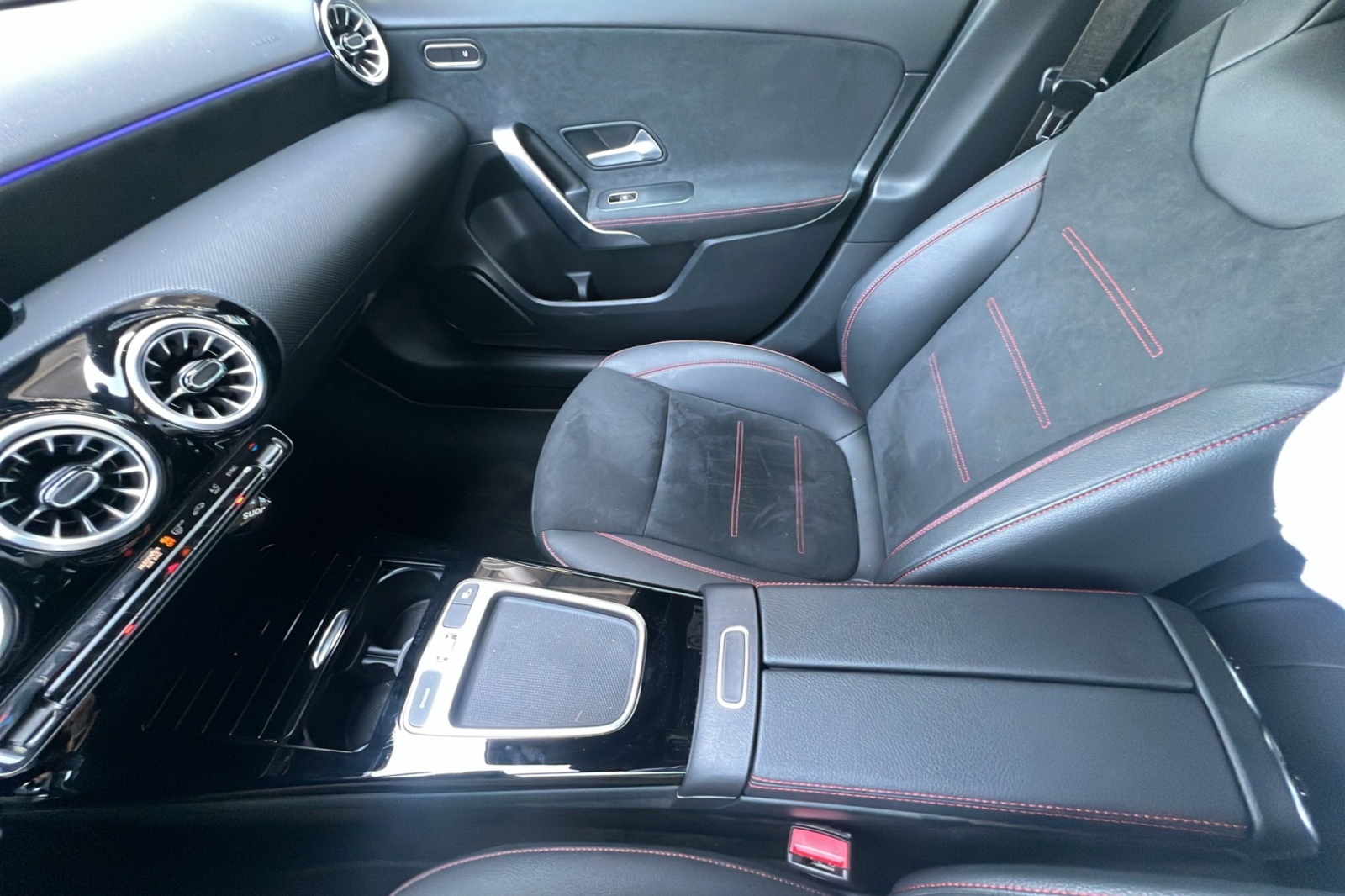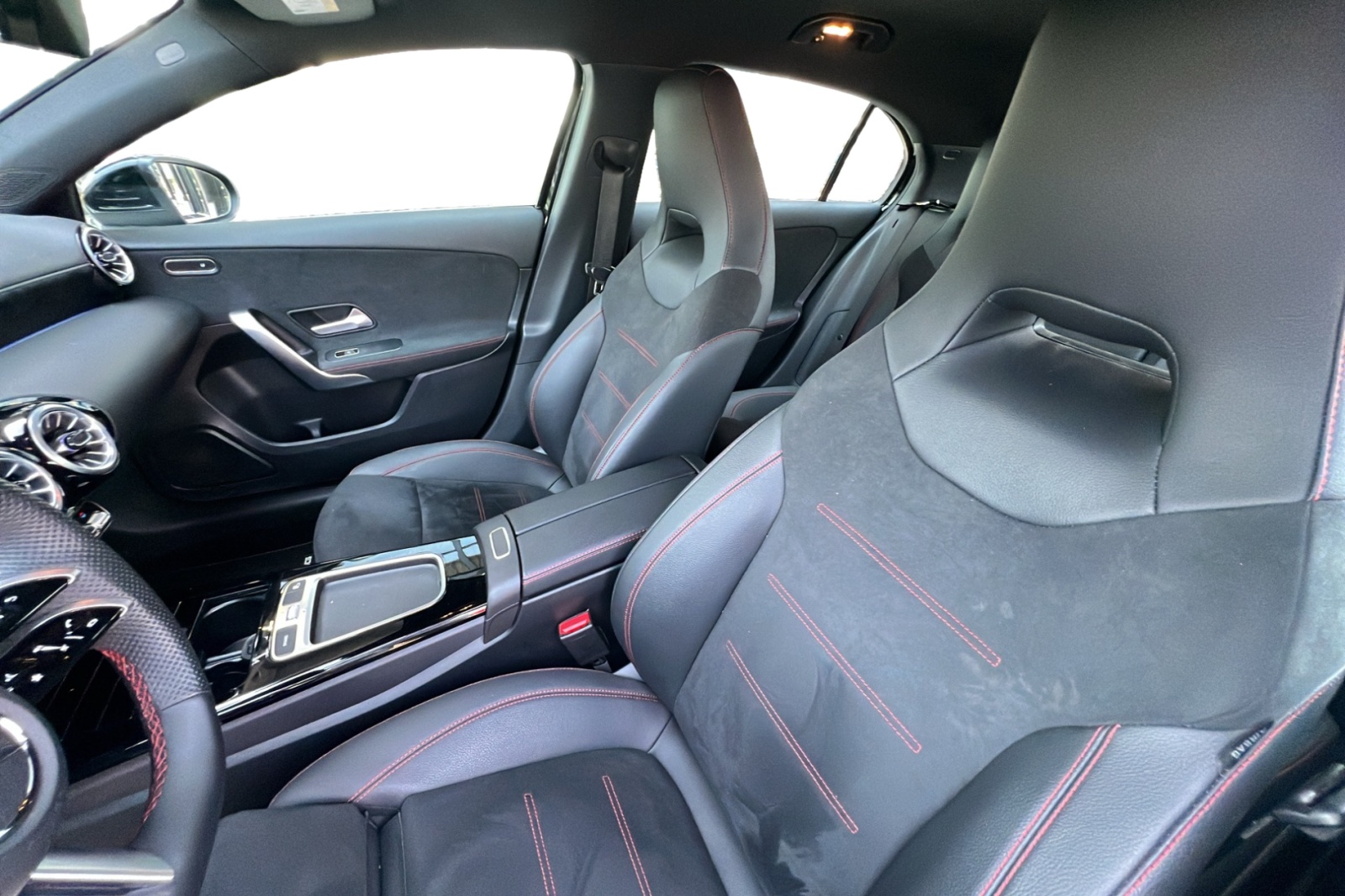 - Volant Sport multifonction en cuir Nappa avec surpiqûres rouges, méplat dans la partie inférieure, perforations dans la zone de préhension, commandes tactiles à gauche et à droite et palettes de changement de rapport au volant chromées argentées