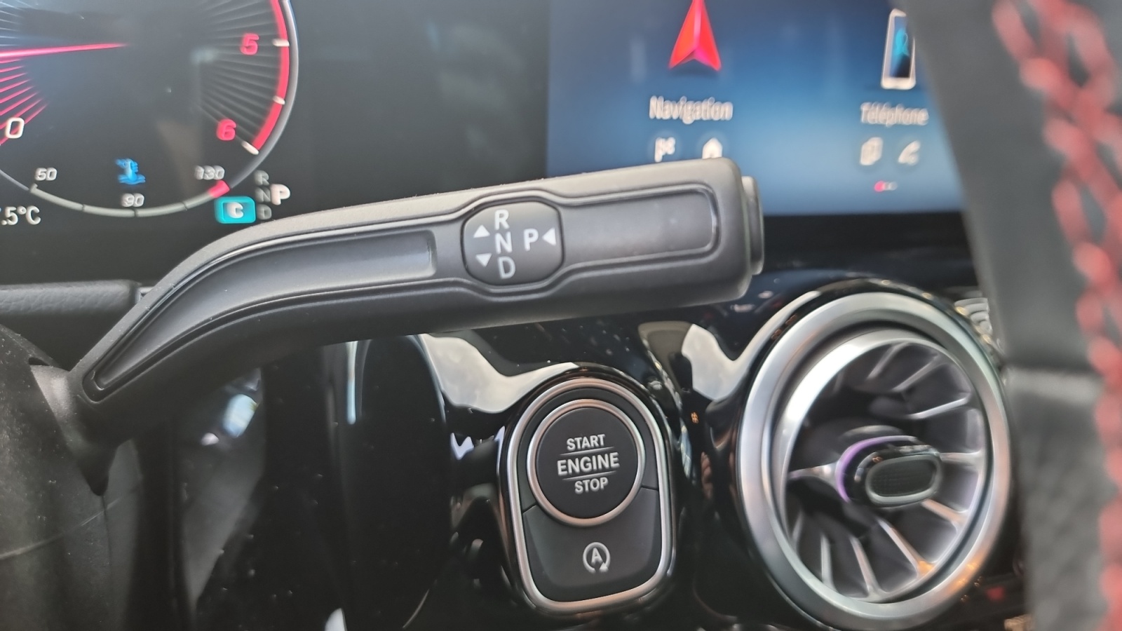 - Volant sport multifonction à 3 double branches en cuir Nappa avec surpiqûres rouges, méplat dans la partie inférieure, perforations dans la zone de préhension, commandes tactiles à gauche et à droite et palettes de changement de rapport au volant chromées argentées