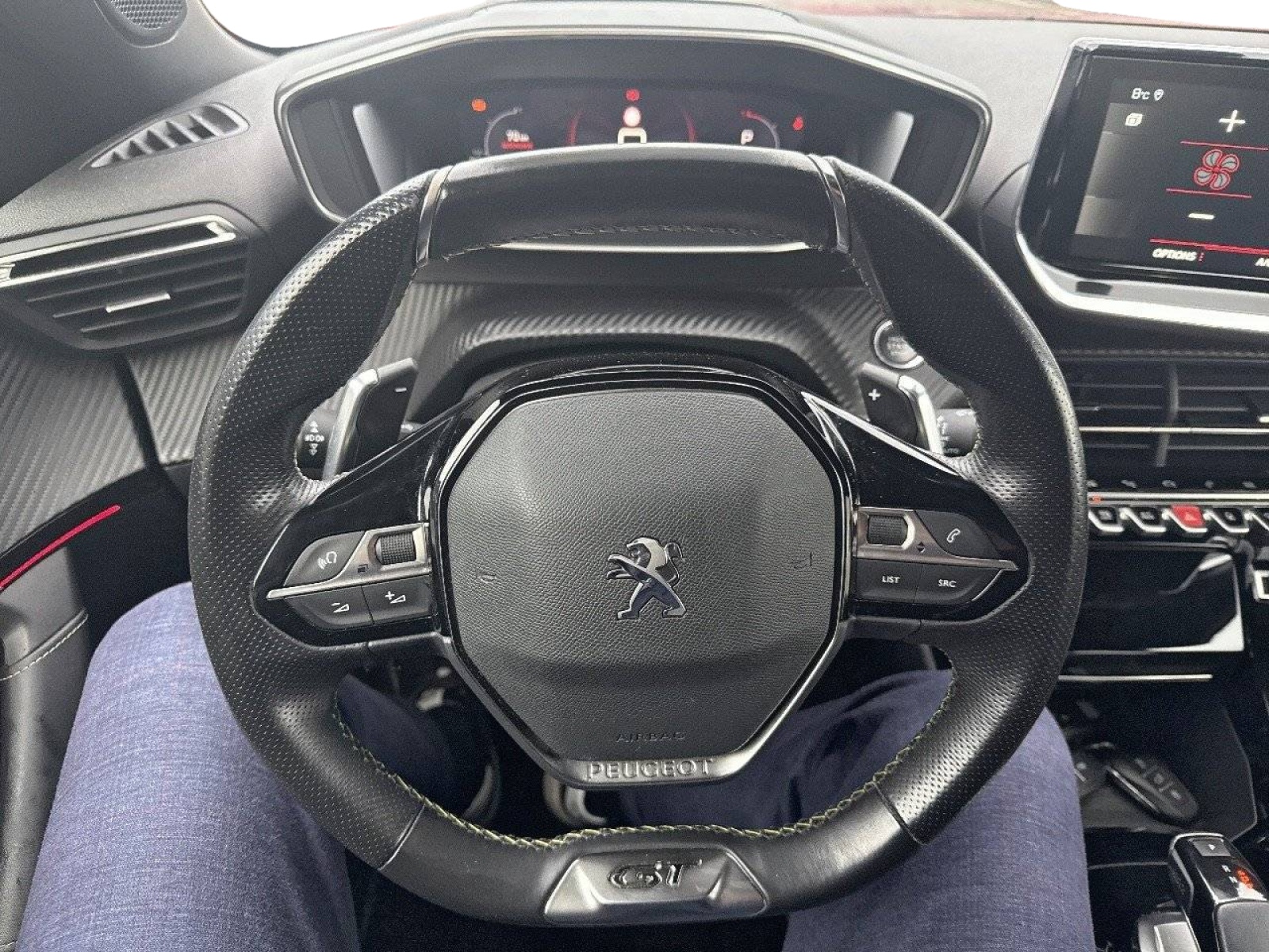 - Volant compact cuir fleur avec laçage vert, Lion chromé et badge GT Line et commandes multimédia sur volant