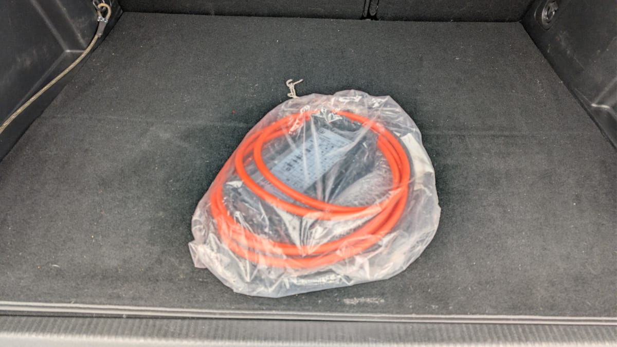 - Plancher de coffre fixe avec articulation pour accès au coffre de rangement du câble de recharge