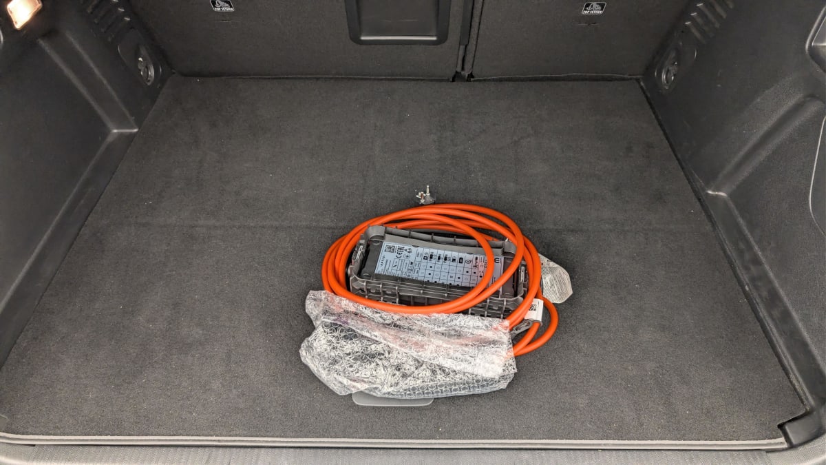 - Plancher de coffre fixe avec articulation pour accès au coffre de rangement du câble de recharge