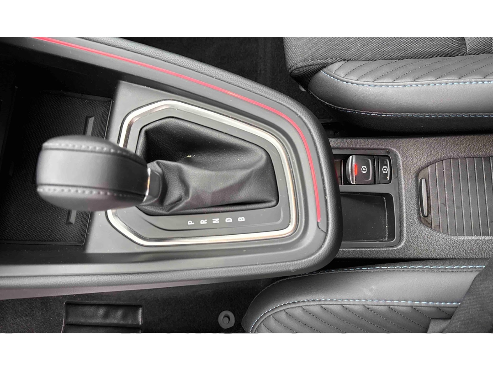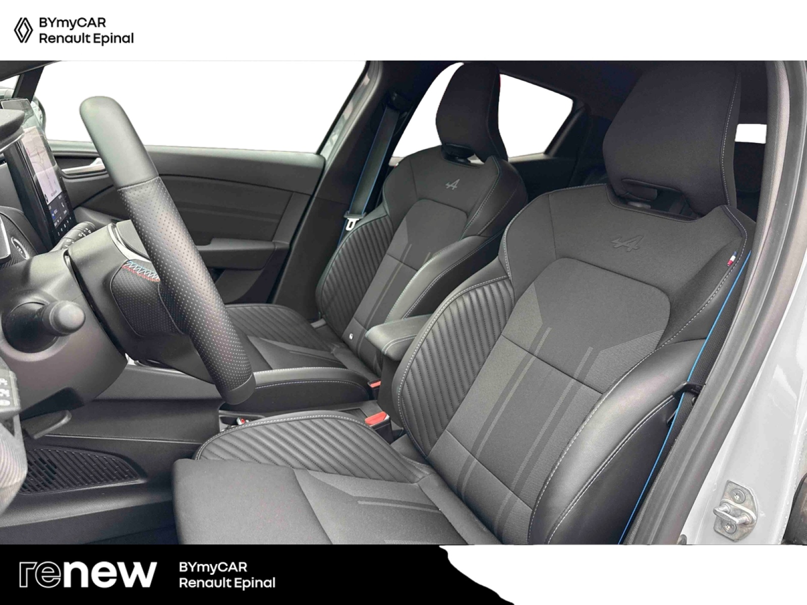 - Sellerie textile gris et textile enduit grainé noir avec surpiqûres bleues