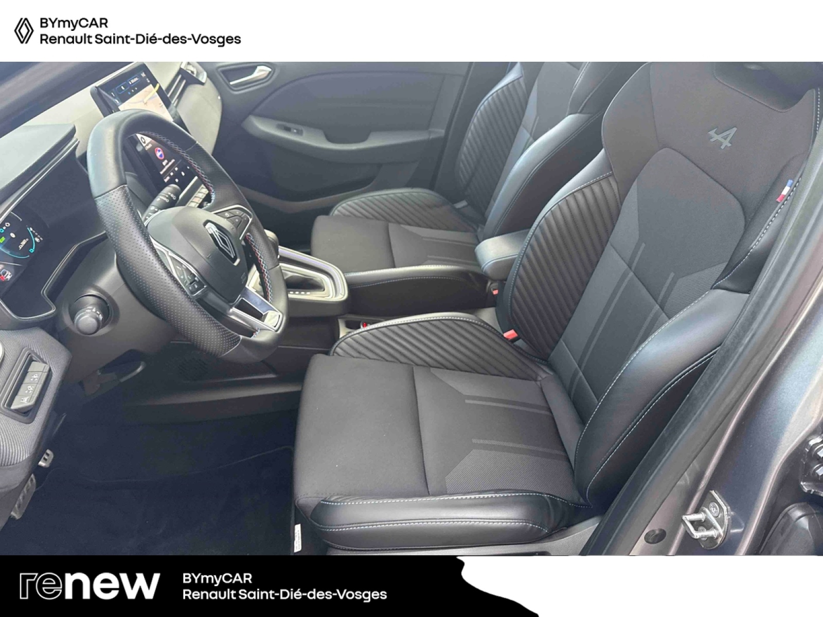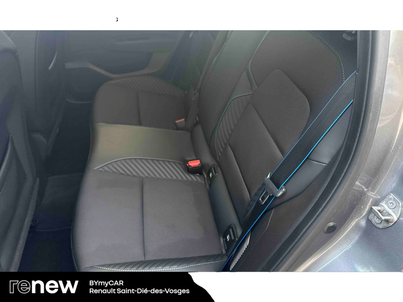 - Sellerie textile gris et textile enduit grainé noir avec surpiqûres bleues